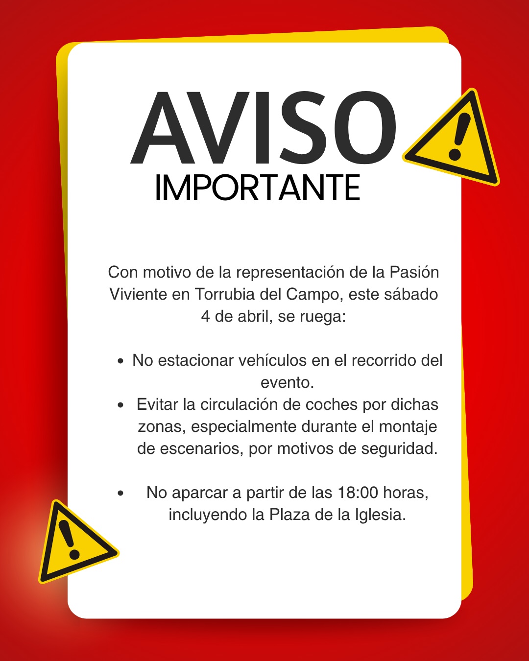 Con motivo de la representación de la Pasión Viviente en Torrubia del Campo, este sábado desde las 20 horas, se ruega a todos los vecinos y visitantes: