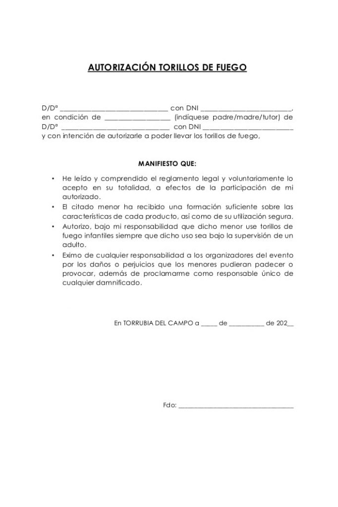 Este documento, que deberá ser cumplimentado y firmado por padres, madres o tutores, es imprescindible para que los niños puedan participar en la actividad durante las fiestas locales. En él, los responsables legales aceptan el reglamento, garantizan que el menor ha recibido formación básica sobre el uso seguro de los torillos y asumen la responsabilidad de su participación.