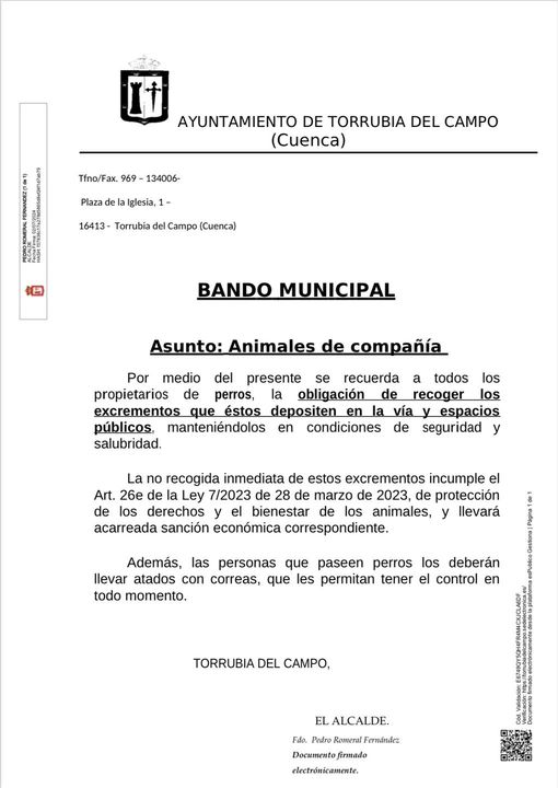 Como recordatorio para mantener la limpieza y la seguridad en los espacios públicos, el gobierno municipal de Torrubia ha emitido un recordatorio para todos los propietarios de perros. Según el Bando Municipal, es obligatorio que los dueños recojan inmediatamente los excrementos dejados por sus mascotas en calles, parques y demás áreas comunes, bajo la amenaza de sanciones económicas.