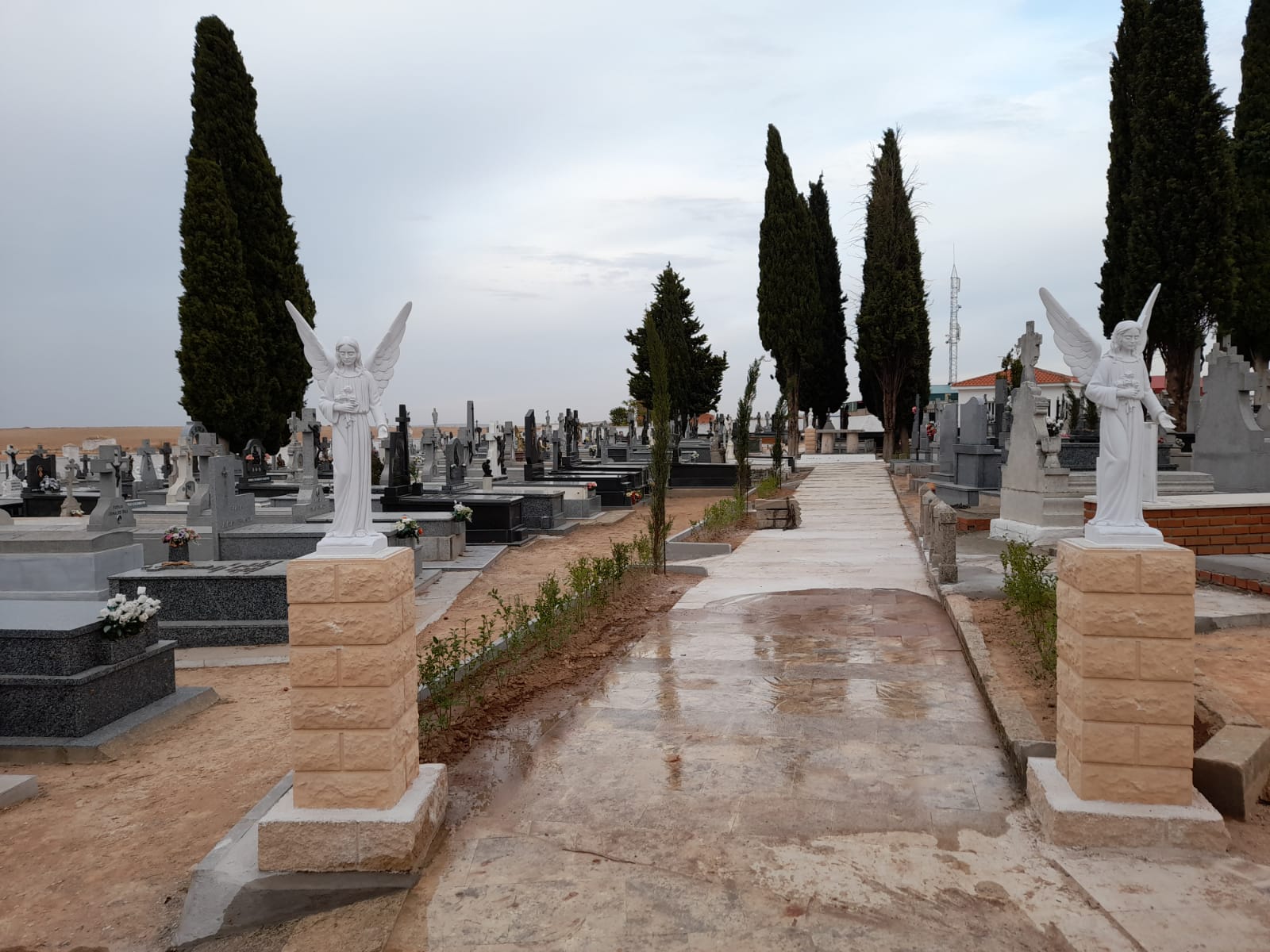 Dos tallas de ángeles blancos colocadas en dos columnas de bloques mirando hacia la puerta principal marcan el inicio de este paseo en el que se han colocado también setos y varios cipreses a lo largo de su recorrido. Así mismo se han realizado y señalizado dos rampas de acceso a las sepulturas de la parte de abajo.