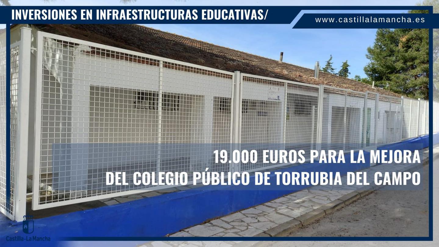 Dentro del plan de inversiones en infraestructuras educativas, el Gobierno de CLM destina 19.000 euros para la mejora del Colegio de Torrubia. Así lo ha anunciado en RRSS el Consistorio Local y la Delegada de la Junta de Castilla La Mancha Marian Martínez. Esta inversión permitirá realizar mejoras en las aulas del CRA Retama de la localidad.
