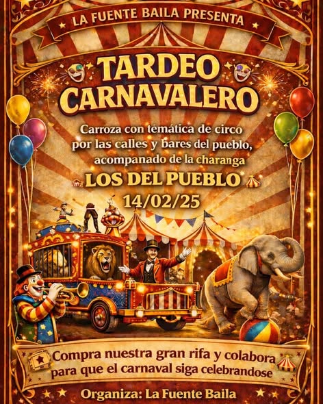 La cita arrancará con un tardeo carnavalero, organizado por la asociación La Fuente Baila, que recorrerá las calles y bares del pueblo con una carroza de temática circense, acompañada por la charanga Los del Pueblo.