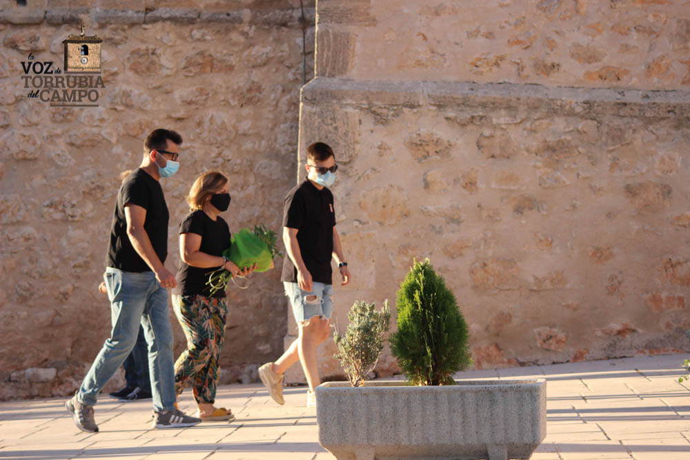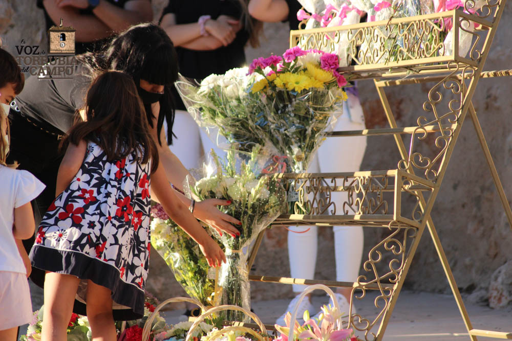 El sol de la tarde iluminaba a la talla de la del Valle. Cumpliendo con la distancia de seguridad y el uso de mascarillas se fueron acercando por riguroso orden las familias y vecinos para acercar sus flores a la Virgen.