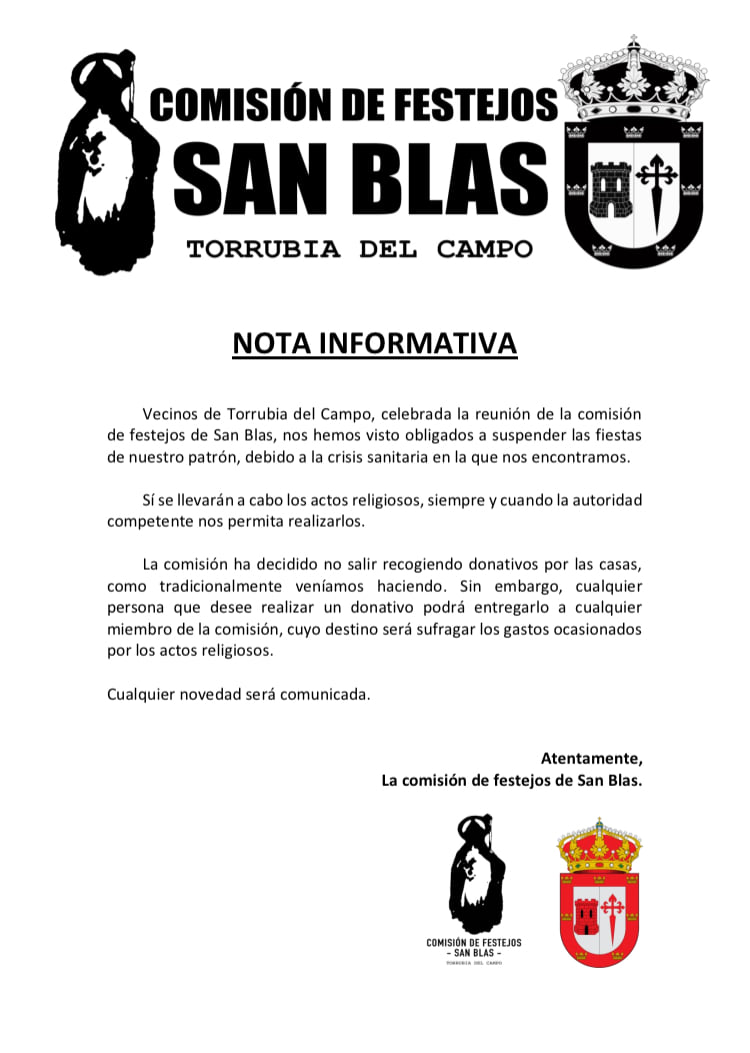 La Comisión de San Blas ha hecho público un comunicado en Redes Sociales anunciando la suspensión de los actos lúdicos de las Fiestas en honor a San Blas que deberían celebrarse en febrero del año 2021.